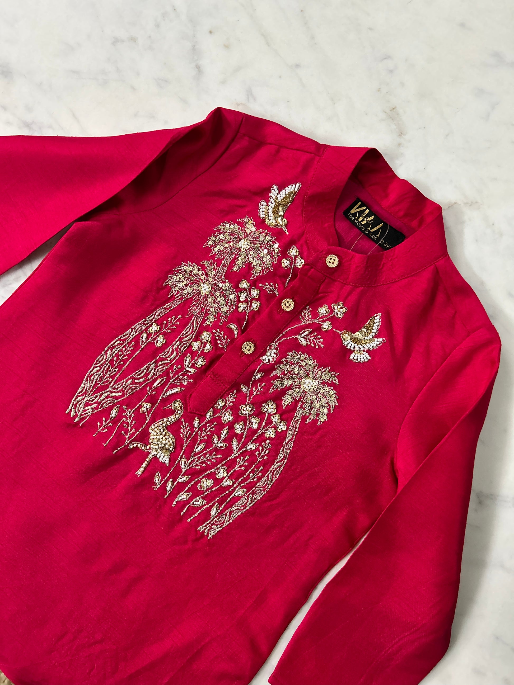 Get ready for a jungle adventure with our vibrant reddish-pink kurta! Perfect for the little explorer, this kurta features a fun jungle theme that's sure to delight. Made from comfortable fabric and intricate sequin and pearl detailing, it's ideal for special occasions. Comes with white pants.